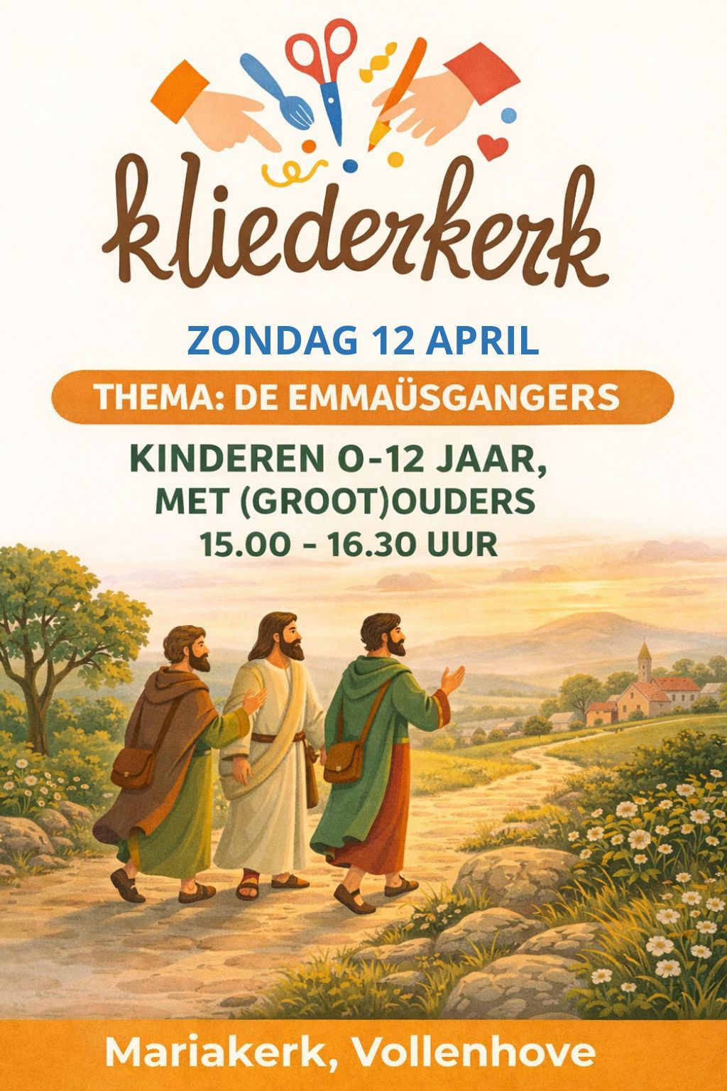 De kerk waar je niet stil hoeft te zitten: voor kinderen van 0-12 jaar SAMEN met (groot)ouder(s). Ga je mee op pad, samen met de Emmaüsgangers? Tijdens deze Kliederkerk ontdekken we het bijzondere verhaal over twee mensen die onderweg zijn. Zij maken wat bijzonders mee, wil jij ontdekken wat dit is? | ||